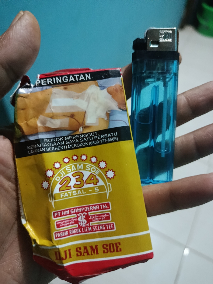 - "An adult human hand holds a Dji Sam Soe 234 cigarette pack and a transparent blue disposable lighter" by FM-Sgztu1, licensed under CC BY 4.0