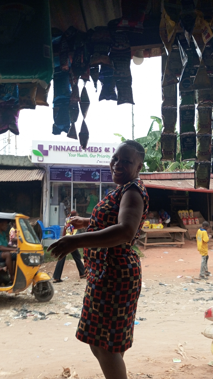 This image captures a street scene in a commercial area of Onitsha, Nigeria. In the immediate foreground, various packaged snack items and goods are suspended from an unseen overhead structure. The central subject is a dark-skinned woman, likely middle-aged, smiling broadly at the camera. She wears a sleeveless, knee-length dress patterned with repeating red, black, blue, and yellow geometric squares. Her right arm is slightly raised, holding a small packaged item. To the woman's left, a yellow motorized tricycle, commonly known as a "keke Napep," is partially visible on a dirt road, with a person seated in the driver's position. In the background, a modern storefront with large glass windows and a prominent sign reads "PINNACLE MEDS & MART," accompanied by the tagline "Your Health. Our Priority." and a partial phone number (08131823...). This building features white walls and purple branding elements. Adjacent to the mart, an open-front stall with a corrugated metal roof displays goods on a wooden table. Further to the right, a young child wearing a yellow shirt stands near this stall, facing away from the camera. The ground throughout the scene is reddish-brown dirt with scattered debris. Green foliage is visible against an overcast sky in the upper right quadrant.