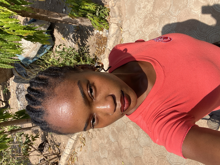 A young, dark-skinned woman with braided hair looks directly at the camera. She is wearing a salmon-colored t-shirt. The sun shines brightly on her face, making her skin glisten. Her lips are full and dark. The background includes a concrete surface, some green foliage, and the shadow of a hand possibly holding the camera. The overall scene seems to be outdoors on a sunny day.