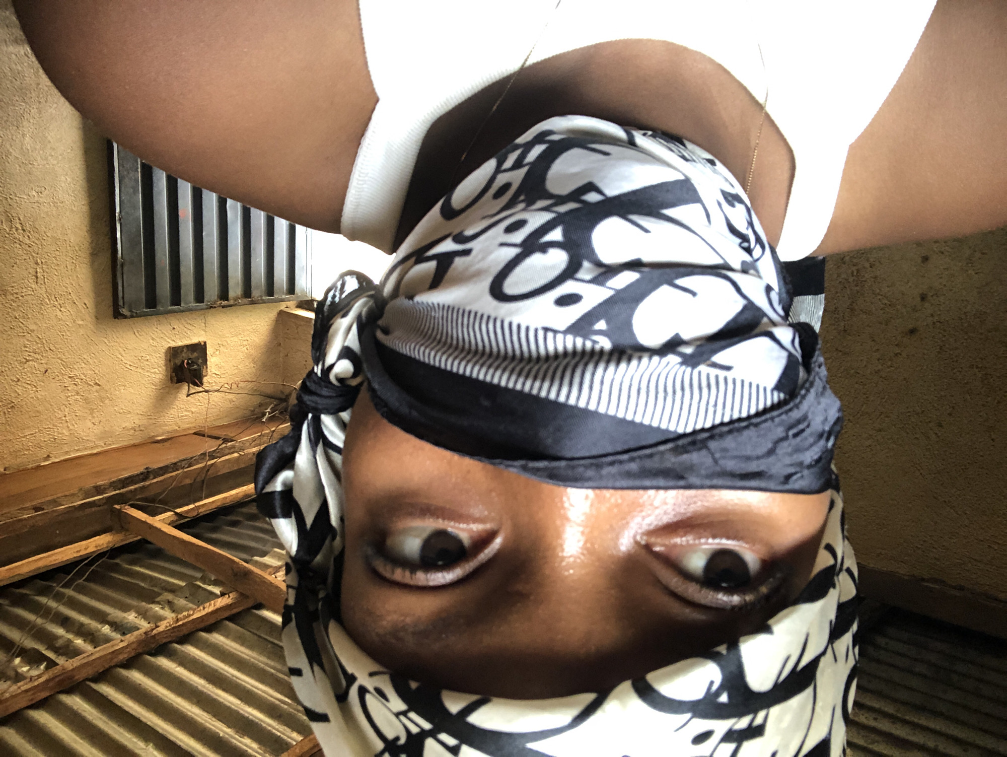 A close-up, high-angle portrait shows an individual with dark skin, situated indoors in Jos, Nigeria. The subject's eyes and forehead are visible, while the lower face is covered by a black and white patterned fabric, which also functions as a head covering. This fabric features abstract black patterns on a white background, with a distinct section of vertical black and white stripes. The individual wears a white tank top, and a thin gold-colored chain is visible on the neck. The eyes are open, directed slightly upward and to the right. The background consists of a textured, light brown wall. Above, exposed wooden beams support a ceiling composed of corrugated metal sheets. Loose dark wires are visible hanging from the ceiling structure. A small, dark rectangular object is mounted on the upper right portion of the wall, and a larger, vertically-slatted metallic object is partially visible on the lower right wall.