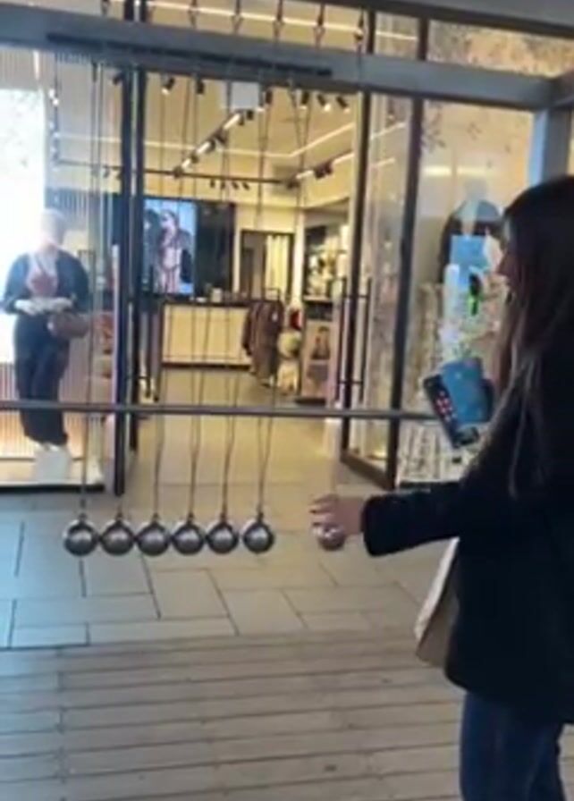 A woman with long brown hair is standing on a wooden deck, facing a Newtons cradle with seven steel balls suspended from a horizontal bar. The cradle is positioned in front of the glass entrance of a store. She releases one of the end balls with her right hand and watches as the momentum transfers through the balls. She is holding a shopping bag in one hand and what appears to be a tablet in the other. Inside the store, there is a mannequin and various clothing displays. The woman is wearing a dark jacket and blue jeans. The scene is well-lit, suggesting it is either daytime or the area is brightly lit.
