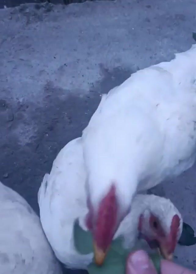- "A hand holds a green leaf in front of three white chickens on a concrete surface" by FM-w4uXC2, licensed under CC BY 4.0