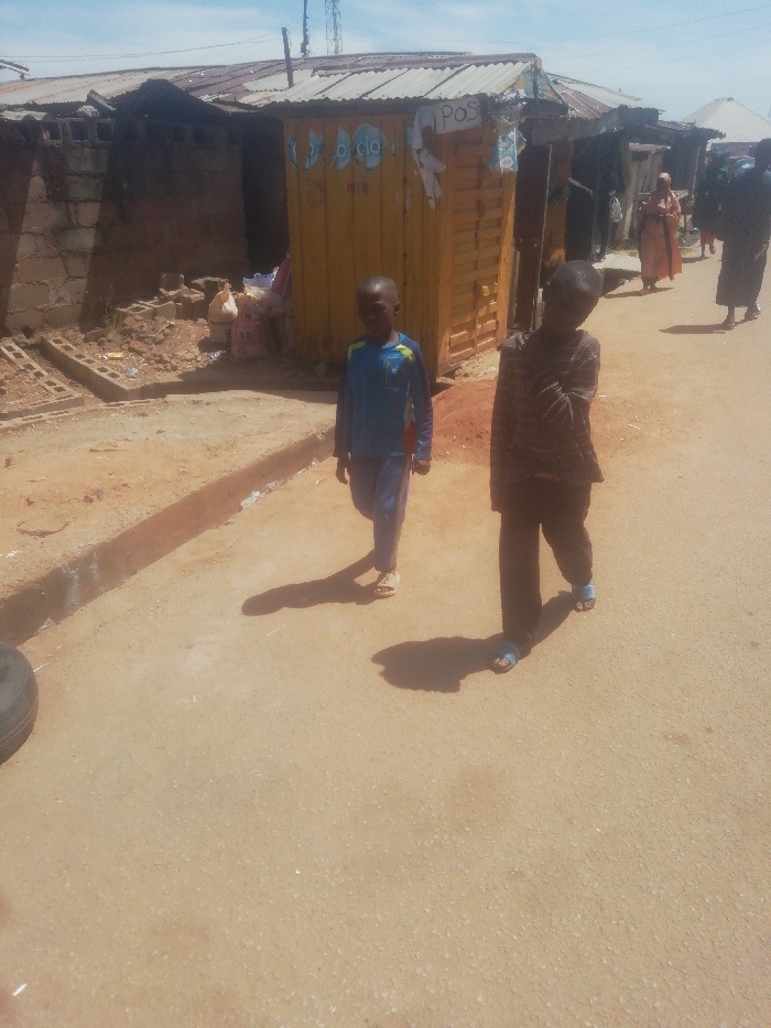 This image captures a daytime scene on a street in the city of Jos, Nigeria. In the foreground, two young boys walk towards the viewer on a light-colored asphalt road mixed with dirt. The boy on the left wears a light blue long-sleeved shirt with white and yellow accents, dark trousers, and light-colored sandals. The boy on the right wears a dark striped long-sleeved shirt, dark trousers, and light blue sandals. Both cast distinct shadows indicating direct sunlight. A dark tire section is visible in the lower left corner. To the left, a structure composed of unrendered concrete blocks with a corrugated iron roof shows signs of disrepair, with loose blocks and sacks visible on the ground beside it. Adjacent to this, a yellow corrugated metal kiosk stands prominently, displaying signage including "POS", "MTN", and "O'clocks", along with torn white papers. Further down the street, additional buildings with corrugated iron roofs are visible. Several adult figures are present in the background, including a woman in a light brown patterned dress and another person in dark attire, both moving away from the camera. The sky is clear blue with minimal clouds. A tall communication mast or tower is visible above the rooftops in the distance. The overall environment suggests a bustling, semi-urban or commercial street.