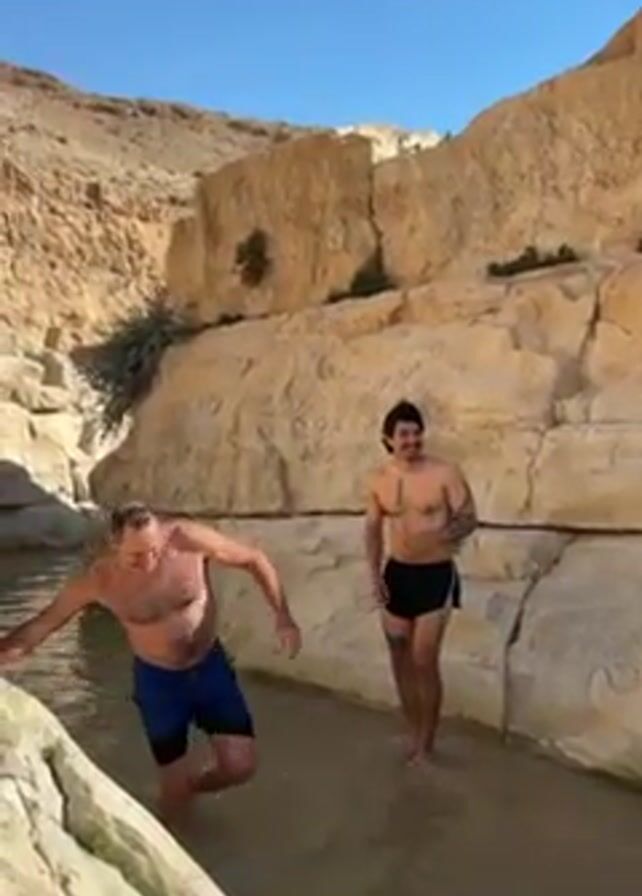 Two men are wading through a narrow waterway between towering rock formations under a clear blue sky. The man closer to the camera has short brown hair and wears blue swim trunks. He tentatively steps into the water, his arms outstretched for balance. The other man, standing slightly further away, has a mustache and wears dark swim trunks. The water appears shallow, and the rock walls rise dramatically on either side. The environment suggests a desert or canyon setting.