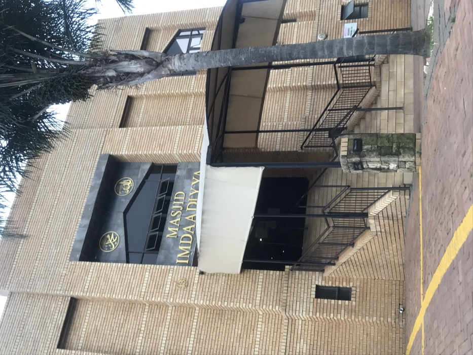 A light brick building with a black square design features gold Islamic symbols and the name "MASJID IMDAADIYYA