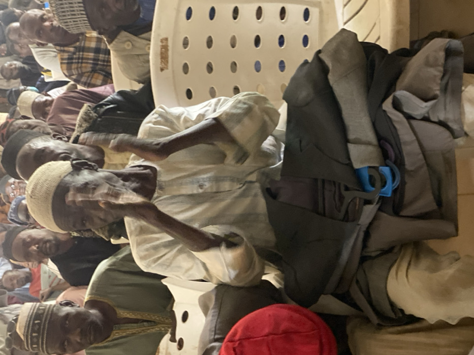 In an indoor setting in Rigasa, Nigeria, an elderly, dark-skinned man is seated centrally, wearing a light-colored knitted kufi cap and a white-and-blue striped long-sleeved tunic