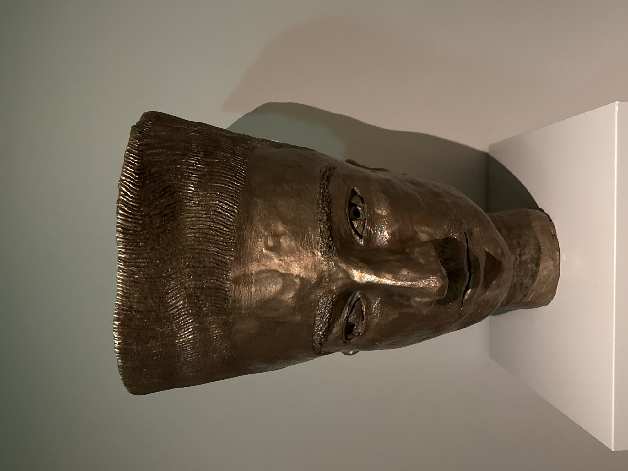 A bronze-colored bust, depicting a stylized human head with a tall, flat-topped headdress featuring a ribbed texture, stands centered on a white, rectangular plinth