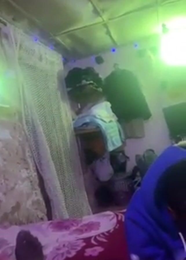 A short video shows a small, untidy room. A person lies on a bed, partially visible, wearing a blue hooded sweatshirt and looking down. Next to the bed, a sheer curtain hangs. In the corner of the room is a disorganized shelf with various items piled on it, including clothes and bags. The room is dimly lit with a green light source, and the ceiling appears to be made of metal sheets. The overall impression is that of a cramped and cluttered living space.