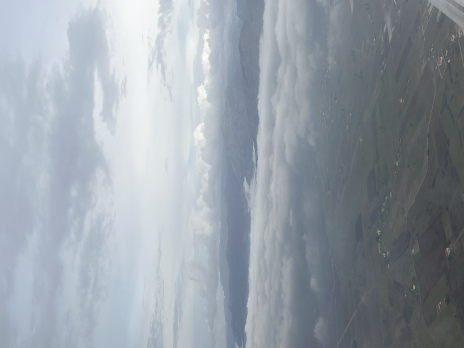 An aerial photograph captures the landscape of the Golubovci municipality in Montenegro under overcast conditions. The upper two-thirds of the image depict a sky dominated by extensive grey and white stratocumulus clouds. Below the higher clouds, a distinct, thick horizontal layer of low-lying fog or cloud obscures the mid-ground, presenting as an opaque band across the scene. Distant mountain peaks are visible above and through breaks in this mid-level cloud layer, appearing muted in color and partially veiled by atmospheric haze. The lower third of the frame reveals the ground topography, observed from above the low-lying fog in some areas. This area consists of an agricultural plain, demarcated into numerous irregularly shaped parcels of cultivated land exhibiting varying shades of green and brown. Scattered light-colored structures, consistent with residential or farm buildings, are sparsely distributed across this plain. Linear features resembling roads or pathways traverse the landscape. A curved white structure, indicative of an aircraft's wing or fuselage component, is visible in the lower right corner of the frame, confirming the aerial perspective. No human figures or discernible activities are present.