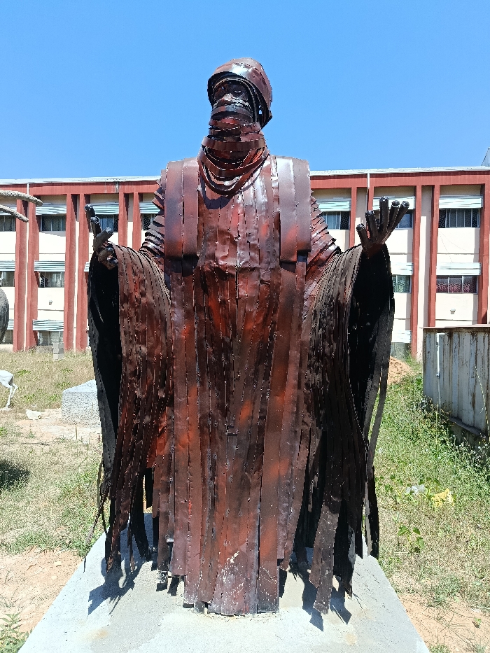 A weathered, reddish-brown metal sculpture, known as "The Man of Peace" or "The Man of the Jos Crisis" by Victor Ehikhamenor, is centrally positioned outdoors on the campus of the University of Jos, Jos, Plateau State, Nigeria