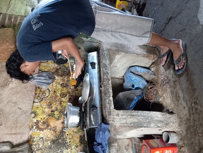 A man in a blue shirt and gray shorts is shown indoors, cooking. He stands over a stove with two burners, using a skewer to prepare food. Nearby, a patterned rug covers the floor. The surrounding area appears cluttered, with items stored in a hole in the wall and along the floor. He is wearing black flip-flops. The room's condition suggests a somewhat rustic or disorganized living space.