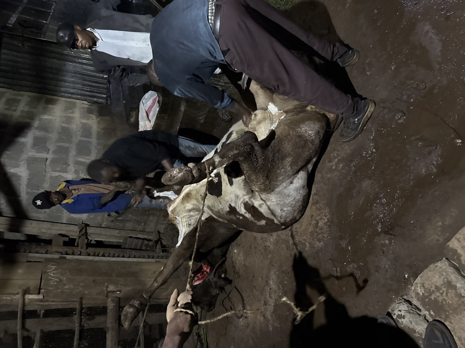 - "The scene depicts the ongoing butchering of a large bovine in Shimbi Masho, Tanzania, under dim artificial light, likely at night" by FM-Mlchq1, licensed under CC BY 4.0