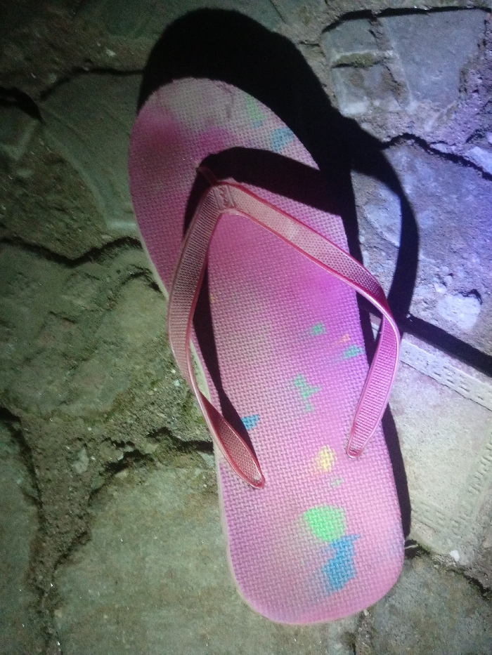 - "A single, left-foot pink foam flip-flop is positioned on an irregularly paved ground surface within an unspecific area of Abuja, Nigeria" by FM-2Dnjj1, licensed under CC BY 4.0