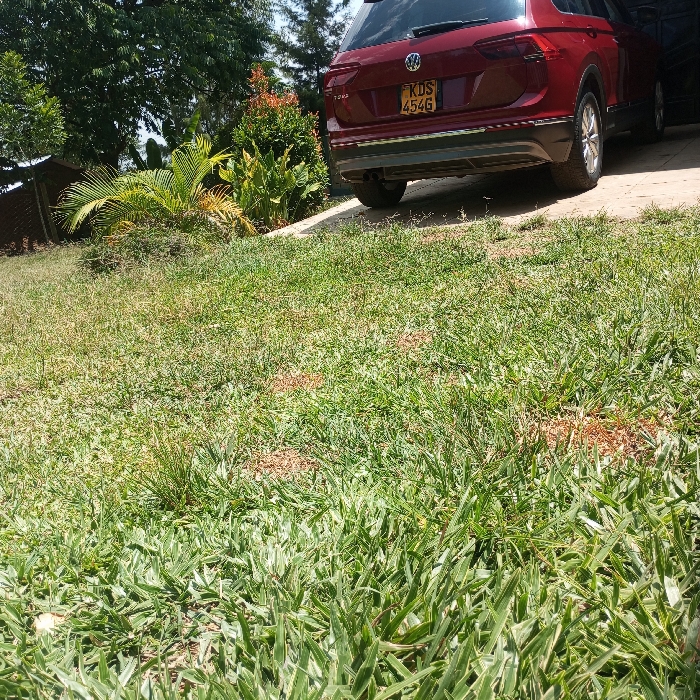 The image portrays an outdoor scene in Mahiakalo ward, Kenya, under daylight conditions. The foreground is dominated by a patch of green grass, exhibiting varied density and several dry or sparse areas. A paved driveway, lighter in color and sloping upwards from left to right, occupies the midground. Parked on this driveway is the rear portion of a dark red Volkswagen Tiguan SUV, displaying the Kenyan license plate "KDS 454G". The vehicle also features 'Tiguan' and 'IQ.DRIVE' badging on its tailgate. The background consists of dense green foliage, including various shrubs, trees, and a palm-like plant, suggesting a landscaped or natural setting. A dark brown fence or wall is partially visible on the far left, behind the vegetation. No individuals are present, and no discernible actions or interactions are occurring.