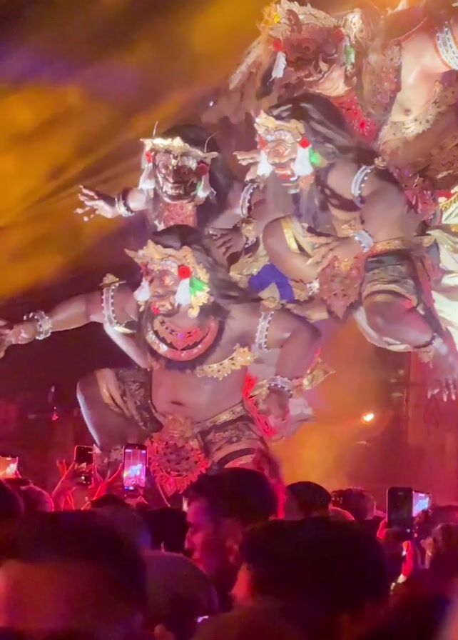 The video captures a nighttime scene with a large crowd of people, many holding up phones to record. The focus is on a tall, elaborate statue or float depicting multiple figures in what appears to be a mythological or cultural context. The figures are adorned with detailed ornamentation and have striking masks. The scene is bathed in colorful spotlights. The overall impression is that of a cultural celebration or performance.