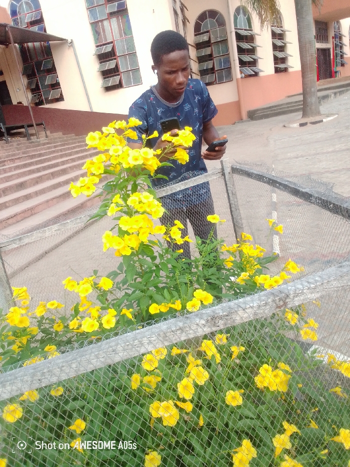 The image depicts an outdoor scene in Onitsha, Nigeria, featuring a young male individual positioned in front of a large institutional building. The male, estimated to be in his late teens or early twenties, has dark skin and short dark hair. He is wearing a dark blue short-sleeved t-shirt with a subtle pattern and dark trousers. A white wireless earbud is present in his right ear. He holds two black smartphones; one is held horizontally in his left hand, directed towards the flowers, possibly for photography, and the other is held vertically in his right hand. The individual stands immediately behind a low, rectangular garden enclosure, approximately waist-height, constructed from wooden frames and wire mesh. This enclosure contains dense green foliage interspersed with numerous vibrant yellow, trumpet-shaped flowers, likely Yellow Bells (*Tecoma stans*). The ground surface around the enclosure is light-colored and paved. In the background, a multi-story building with light beige-peach colored walls is visible. The building's facade features multiple windows, each characterized by an arched top and horizontally slatted louvered panes. A broad concrete staircase, composed of several tiers, ascends towards an entrance area on the left side of the building, partially covered by a dark awning. A segment of a palm tree trunk is partially visible on the far right side of the frame. The scene is illuminated by natural daylight, indicating clear weather conditions.