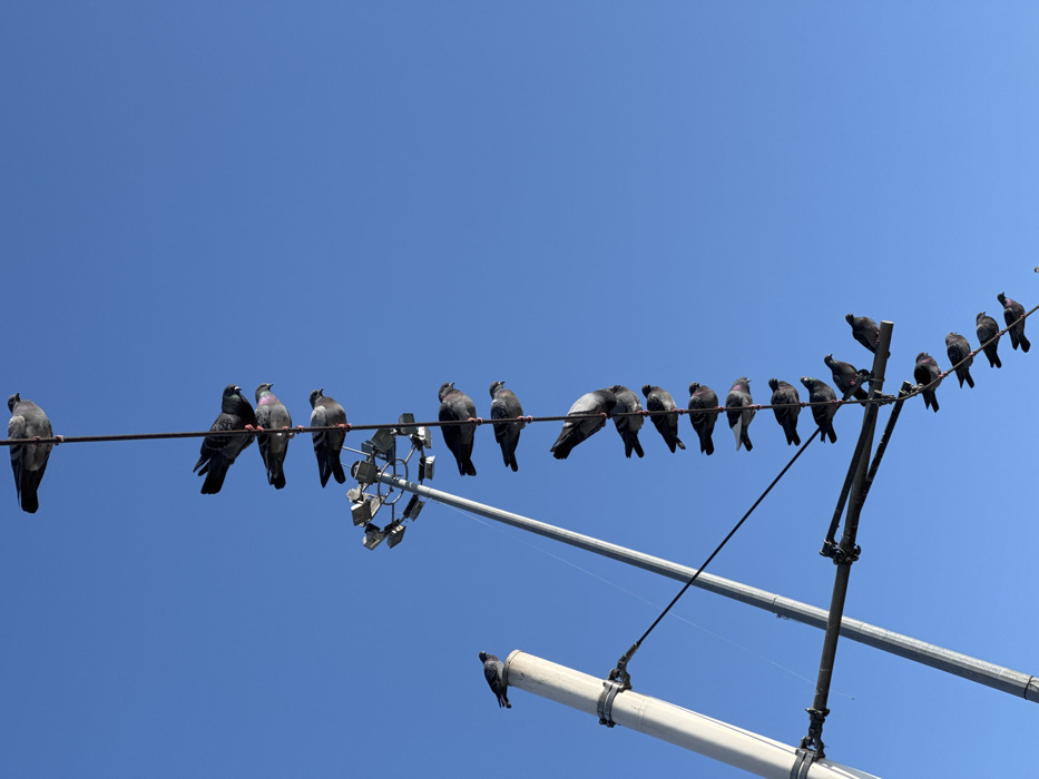 The image displays an urban environment in Beyoğlu, Turkey, under a clear blue sky. Dominating the scene are two utility poles and associated cabling. A light-colored, thick utility pole stands on the left, topped by a single grey pigeon. To its right and slightly behind, a darker, slender utility pole features a circular array of multiple floodlights near its top. Various dark electrical cables are strung between and from these poles. A primary dark cable descends vertically from the upper right, hosting a precise line of eleven grey pigeons. Below this vertical line, a dark, angled support bar extends from the floodlight pole's structure, with three additional pigeons perched on it. Further down and to the right, a separate lower dark cable supports a line of seven more pigeons. In total, twenty-two pigeons are present, all stationary and perched on the utility infrastructure. The overall environment is illuminated by bright daylight, with no other people, vehicles, or buildings visible, emphasizing the stark contrast of the infrastructure and birds against the expansive, cloudless sky.