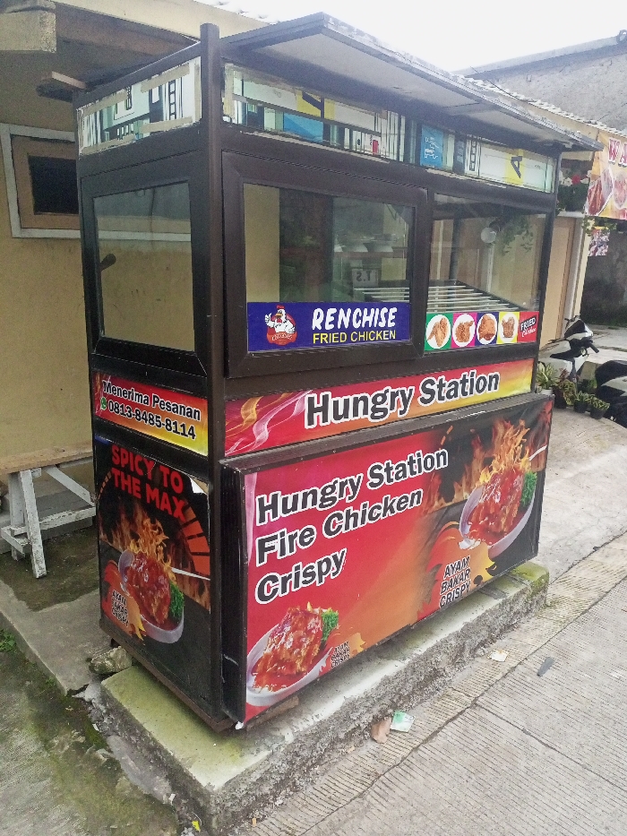 A food stall advertises "Hungry Station Fire Chicken Crispy" and "Renchise Fried Chicken