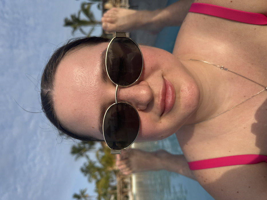 A close-up, eye-level portrait depicts an individual in a swimming pool. The person, appearing female, has dark hair pulled back and wears oval sunglasses with light-colored frames, obscuring the eyes. A slight smile is visible. A bright pink swimsuit strap is present on the left shoulder, and a delicate silver-toned necklace with small pendants rests on the chest. Bare feet are visible above the water in the blurred background. The background consists of a light blue sky with scattered clouds, multiple palm trees, and indistinct structures typical of a resort. Natural sunlight illuminates the scene. The specific location within the city of Zanzibar, Tanzania, is not discernible, but the environment is consistent with a coastal resort area on the island.