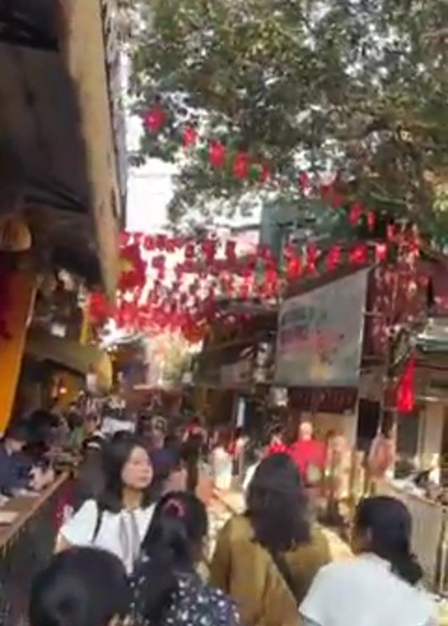 crowded street scene in a foreign country, likely Vietnam, as evidenced by the numerous Vietnamese flags strung overhead. The street is lined with small shops and restaurants, many of which have outdoor seating areas. People of various ages and ethnicities are walking through the street, some passing in front of the camera. The scene appears bustling with activity, creating a vibrant and lively atmosphere. The lighting suggests it's daytime, and there's a mix of natural light and shadows. A man wearing a black jacket walks directly in front of the camera.
