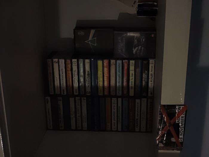 The image displays a dimly lit section of a shelf within an indoor environment. On the upper shelf, two vertical stacks of audio cassette tapes are present. The left stack includes visible titles such as "MAC MILLER SWIMMING," "PHIL WOODS QUARTET," "THE BEATLES," "BEATLES ABBEY ROAD," "REM," "INXS GREATEST HITS," "ALICE COOPER," "LIFE LIVING," "QUEEN INNUENDO '91," and "DEEP PURPLE." The right stack displays titles including "GHOSTFACE KILLER," "BREAKFAST CLUB," "Patrick Swayze Jennifer," "E.T.," "SURF OR DIE," "PANK RAH," and "LEE MORGAN The Top3." To the right of these stacks are two larger, black box sets: one features the Pink Floyd "Dark Side of the Moon" prism logo, and another is marked "METALLICA." On the lower shelf, a small, rectangular item with partially visible text "LEPRE," "ADRENALIN," and "28. NOVEMBER 20__" is present, marked with a prominent red "X." Two small, dark cylindrical objects are also visible on the far right of the lower shelf. The specific location in Florence, Italy, cannot be determined from the provided visual information.