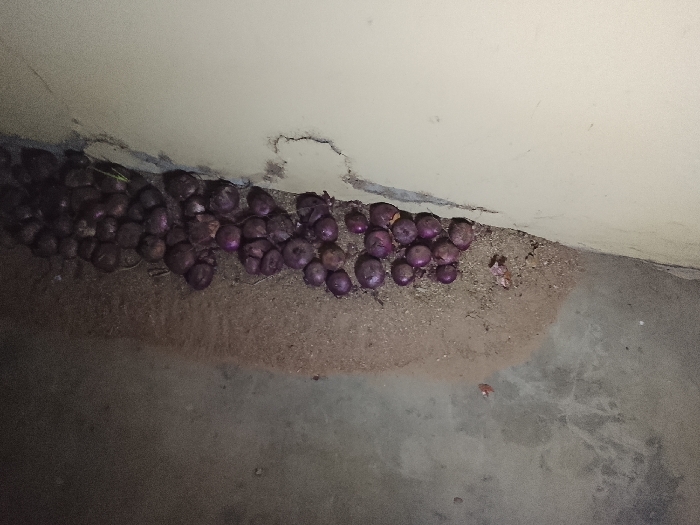 A pile of red onions sits on a dirt-covered floor against a white wall. The onions are tightly packed together, some with green sprouts emerging. The wall has visible cracks and imperfections near the base. The floor is a mix of dirt and concrete, showing signs of moisture or staining. The lighting in the area is dim and uneven.
