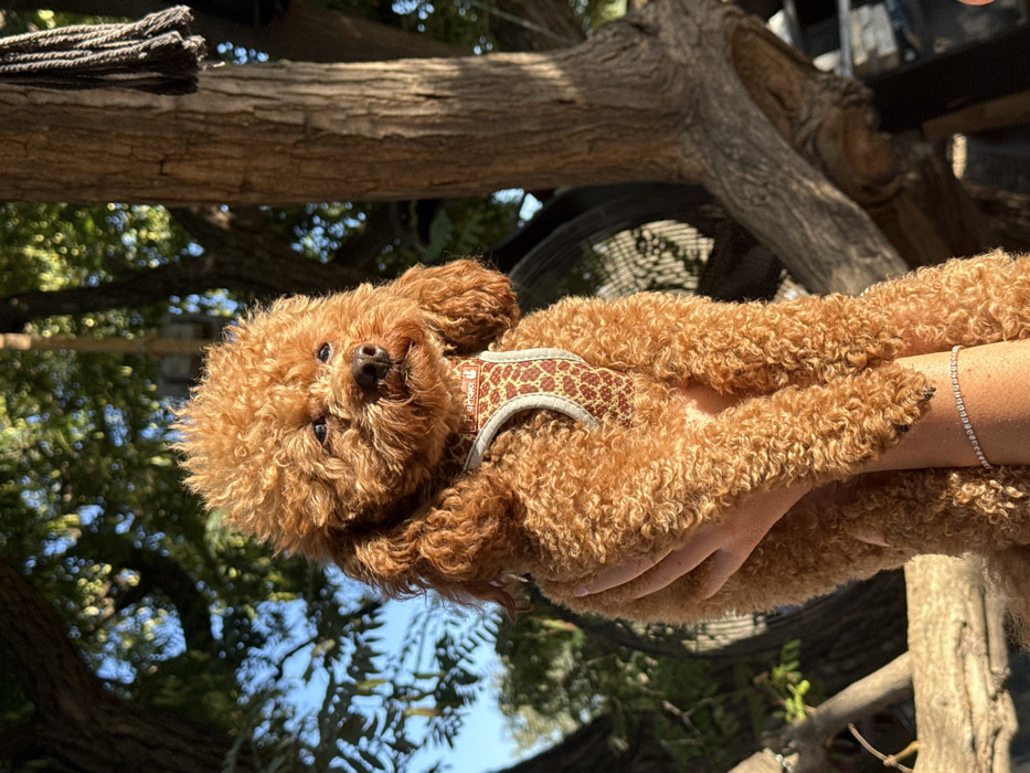 A reddish-brown, curly-haired dog, consistent with a Poodle, is depicted held upright by a human arm and hand in Kfar Ruth, Israel. The dog wears a patterned harness, light brown with dark brown accents, featuring a visible "Pethome" label. A human wrist, bearing a silver-toned tennis bracelet with small clear stones, is visible beneath the dog. The scene is outdoors under direct sunlight. The background consists of multiple trees with visible trunks and dense foliage, and patches of clear blue sky. A prominent tree trunk is positioned on the right side of the frame, and dark, coiled material hangs from an unseen fixture in the upper right portion of the image.