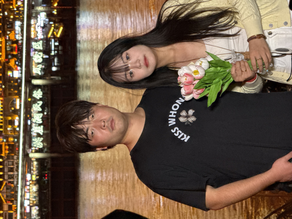 This image depicts two East Asian individuals, a male and a female, standing side-by-side on the bank of the Jialing River in 江北城街道 (Jiangbeicheng Subdistrict), Chongqing, China, at night. They are positioned facing the camera, with the illuminated cityscape of the Yuzhong District, including the prominent Hongyadong complex (indicated by visible Chinese characters "洪崖洞民俗") and a bridge, visible across the river in the background. The male, on the left, has dark hair with a lighter streak in the front and a neutral expression. He wears a loose-fitting black t-shirt with the text "KISS WHON" and a greyish-brown floral graphic on the left chest. His arms are mostly out of frame, with his left hand partially visible by his side. The female, on the right, has long dark hair with bangs and a neutral expression. She wears a light-colored (possibly white or cream) top under a pale yellow cable-knit cardigan. She holds a bouquet of approximately 10-12 artificial tulips in shades of pink and white with green leaves, tied with a translucent white ribbon, in her clasped hands at waist level. She has multiple rings on her left hand and a reddish-brown beaded bracelet on her right wrist. The river behind them reflects the numerous warm-toned lights from the distant buildings and bridge. The scene is artificially lit, suggesting a flash or direct light source on the subjects, creating a contrast with the ambient city lights.