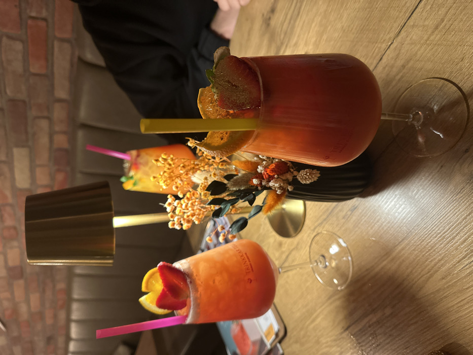 This image captures an indoor scene at a restaurant or bar in Weißenburg in Bayern, Germany. The foreground features a light-colored wooden table displaying three cocktails and a decorative centerpiece. On the right, a stemmed glass contains a red-orange beverage with a yellow straw, garnished with a dried orange slice and a strawberry half. On the left, a similar stemmed glass holds an orange-pink beverage with a pink straw, garnished with an orange wedge and a strawberry. Both stemmed glasses bear a vertical "TRINKKARTEN" inscription. Between these drinks, a small black fluted vase contains dried floral elements in orange, yellow, and muted green. A brass-toned table lamp with a cylindrical shade stands behind the floral arrangement, casting light. In the background right, a person's torso and arms are visible, clad in a dark, long-sleeved garment. Behind the table lamp, a third, smaller yellow-orange cocktail with a pink straw and a green garnish is present. The background consists of a textured brick wall and dark upholstered booth seating.