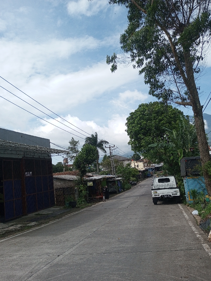 A narrow asphalt road winds uphill, flanked by buildings and lush greenery. On the left, a large structure with blue metal doors dominates the view, while on the right, a white truck is parked beside a tree. Power lines stretch across the sky above the buildings. Distant mountains are visible through the trees. A small palm tree grows in the middle distance to the left of the road. There are a couple of people standing near a stall.