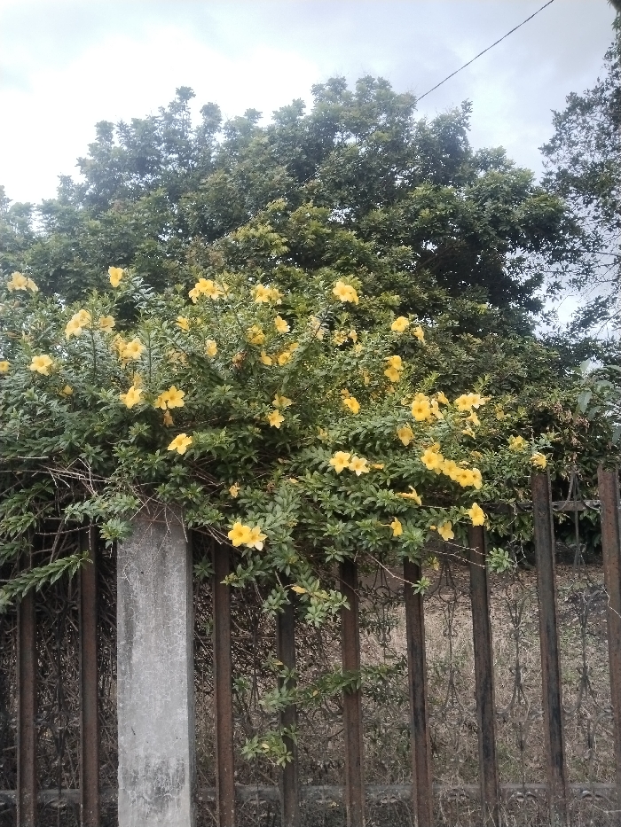 - "An outdoor scene in Keudegeudong, Indonesia, depicts a dense flowering bush with numerous bright yellow, trumpet-shaped blossoms and dark green foliage, growing over and through a rusted metal fence" by FM-vhmNj2, licensed under CC BY 4.0