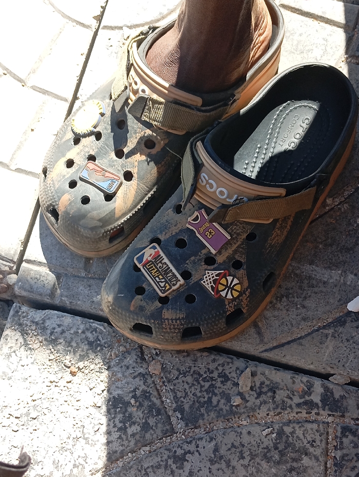- "A pair of feet, partially visible, wears two dark-colored Crocs clogs with tan accents" by FM-hF7Ke2, licensed under CC BY 4.0