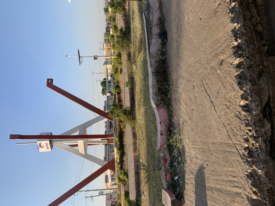 An Airtel sign stands against a clear blue sky, supported by a structure of white and red beams. Behind the sign, a strip of green lawn bordered by a walkway separates it from a distant row of buildings. The immediate foreground is dominated by a rough, textured road surface. Power lines stretch across the background, adding a sense of scale.