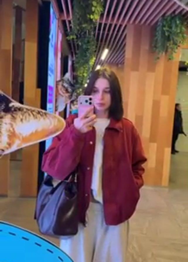 A young woman is taking a selfie in a brightly lit, modern shopping mall. She stands facing a large mirror, her phone held up in her right hand. She is wearing a maroon button-down jacket over a white shirt that reveals a sliver of her midriff, and light grey sweatpants. A dark brown handbag hangs off her left shoulder. Her hair is dark and shoulder-length. The mall has a quirky, playful design with wooden beams across the ceiling interspersed with hanging artificial plants, and large cutouts of cats. People are walking in the background.