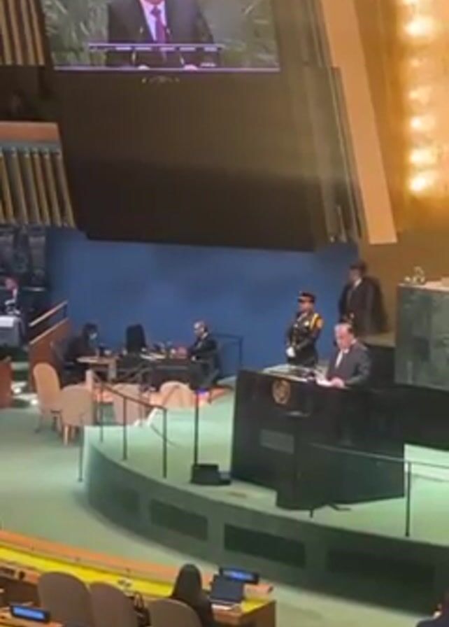 The video captures a large conference room at what appears to be a formal event. The primary subject is a speaker delivering a speech from a podium, his image mirrored on a large screen behind him. The room is largely empty, with clusters of people seated at tables towards the front and sparse seating in the rows of chairs behind. An officer in uniform stands to the right of the podium. The room is decorated with green carpeting and blue walls.