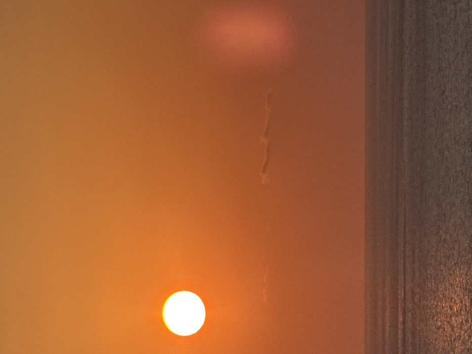 The image displays a coastal view from Alonia, Greece, captured during either sunrise or sunset. The sky, occupying the upper two-thirds of the frame, is characterized by a strong orange to reddish-orange hue. A distinct, bright white circular sun is positioned in the upper-left quadrant. A thin, horizontally elongated cloud formation is visible in the mid-left portion of the sky. In the upper-right quadrant, a faint, diffuse, reddish vertical glow is present, consistent with a lens flare or atmospheric scattering. The lower third of the image depicts a calm body of water, appearing dark blue-grey with subtle surface texture. A sharp, level horizon line distinctly separates the sky from the water. No individuals, vessels, or specific land features are discernible within the frame.