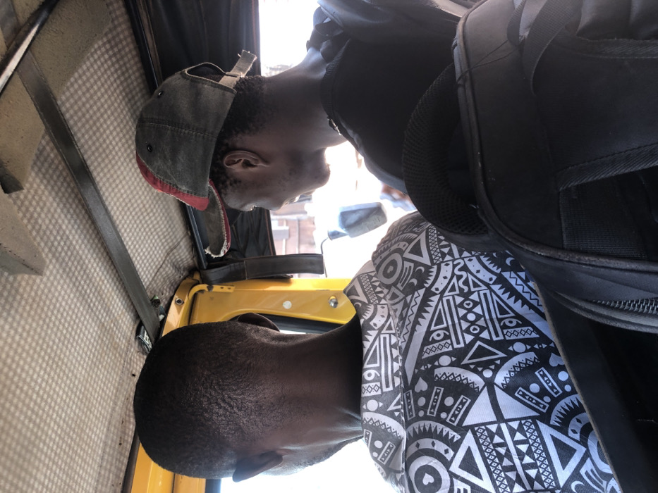 The scene depicts the interior of a yellow motorized tricycle, likely in Nnobi, Nigeria, during daylight hours. Two male individuals are seated as passengers. The individual in the left foreground is viewed from behind, exhibiting short, dark hair and wearing a collared shirt with a distinctive black and white geometric pattern. To their right, a second male is visible from the left profile, facing towards the right side of the vehicle. This individual has short, dark hair, wears a black t-shirt, and a distressed green and red baseball cap worn backward. A black backpack is positioned in the lower right foreground, partially obscuring the second individual. The vehicle's interior features a yellow metal frame and a light-colored, checkered fabric ceiling. A black strap is visible across the ceiling. Through the open side of the vehicle, a blurred background suggests movement, with faint architectural elements, including a reddish-brown building, visible. No direct interaction between the two individuals is discernable; both appear to be observing the environment outside the vehicle.