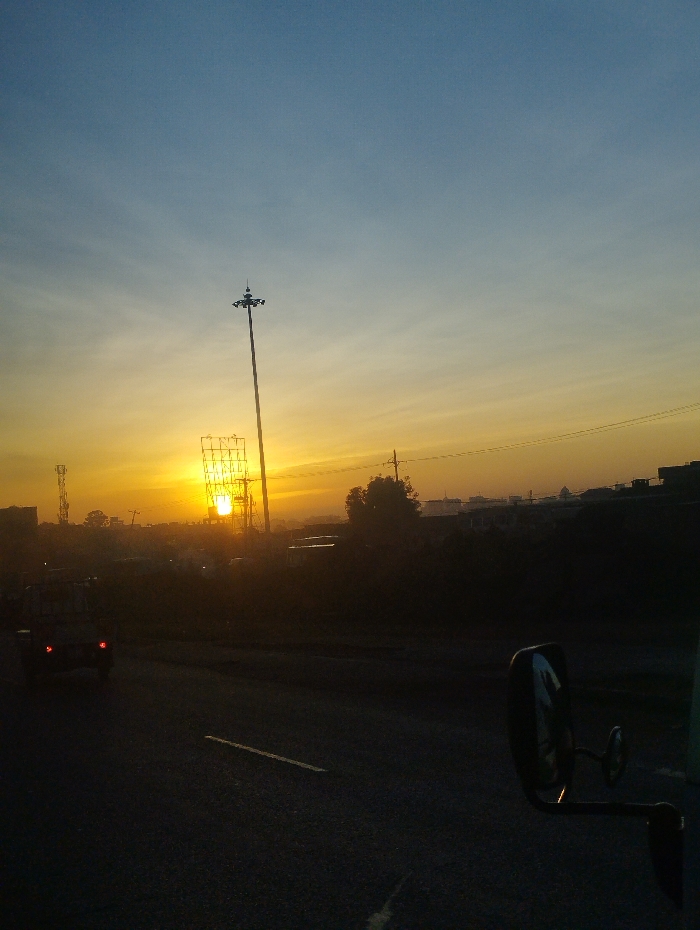 A low-angle, eye-level shot depicts an early morning or late evening scene on a road. The sky transitions from blue to a vibrant orange where the sun shines. A tall light pole stands prominently. Buildings and trees form a dark, silhouetted skyline. A vehicle is slightly visible on the road. A side mirror of the vehicle from where the picture is being taken is seen at the bottom right of the image. The road itself is dark, with a single white line marking the lane.