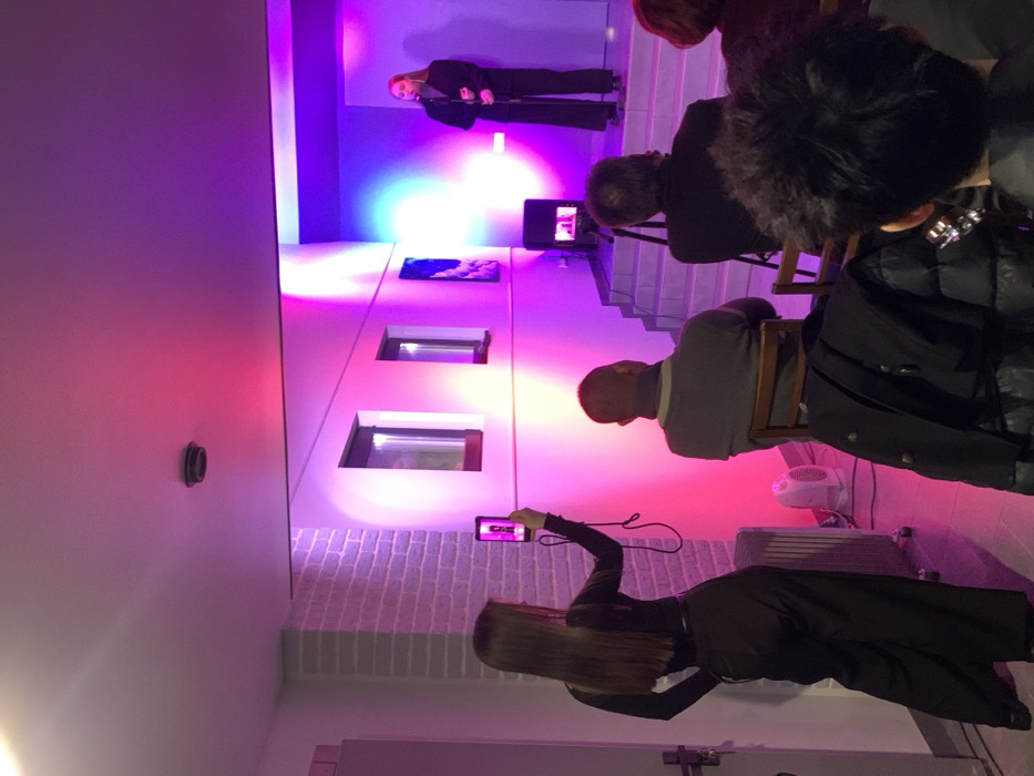 The image displays an indoor performance venue in Kyiv, Ukraine. A female performer, dressed in dark clothing, stands on a multi-tiered stage holding a microphone. The stage area is illuminated by colored lights, predominantly pink, purple, blue, and green, which project onto the surrounding white walls. To the left of the performer, a dark, box-shaped object with an illuminated interior and a black tripod are present on the stage floor. In the left foreground, a standing female individual, with long brown hair and dressed in a black long-sleeved top and black wide-leg trousers, holds a smartphone vertically, recording the performer. A black cable extends from the phone. A grey metal radiator and a white electric fan heater are positioned on the floor nearby. The adjacent wall segment features grey, brick-like textured paneling, and a grey door is visible on the far left. Two dark, rectangular windows are set into the wall behind the audience, with a vertical artwork showing blue and white forms located further right. Multiple audience members are seated on wooden chairs in the middle ground, facing the stage. Two males are visible from the rear; one wears a grey sweater, the other a dark jacket. A person's dark-haired head and a dark puffer jacket on a chair are visible in the immediate foreground. A dark circular smoke detector is affixed to the white ceiling.