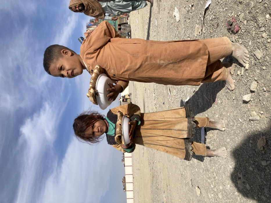 The image depicts a daytime scene in Chaman City Tehsil, Pakistan, under a clear blue sky with sparse clouds. Two young children are centrally positioned on an unpaved, dusty, and gravelly ground. The child on the left is a girl, appearing to be approximately 4-6 years old, with dark hair, wearing a light brown long-sleeved dress with dark trim and chain-like embellishments. She holds a white disposable bowl containing several pieces of flatbread. Her bare feet are visible, and her expression is neutral, directed towards the viewer. The child on the right is a boy, appearing slightly older, approximately 6-8 years old, with short dark hair, wearing a loose-fitting orange/tan traditional garment. He holds a similar white disposable bowl with flatbread. His bare feet are visible, and he is looking up and to the right, mouth slightly open. In the background, to the right, a bearded adult male wearing a light green garment and a brown head covering is partially visible, walking or standing behind the boy, with a slight smile. Behind them, a large truck with cargo piled high is parked. Further in the background, to the left, a low white wall runs horizontally, with indistinct vehicles and structures beyond it, including a yellow auto-rickshaw. The ground contains scattered debris. Strong shadows indicate bright sunlight.