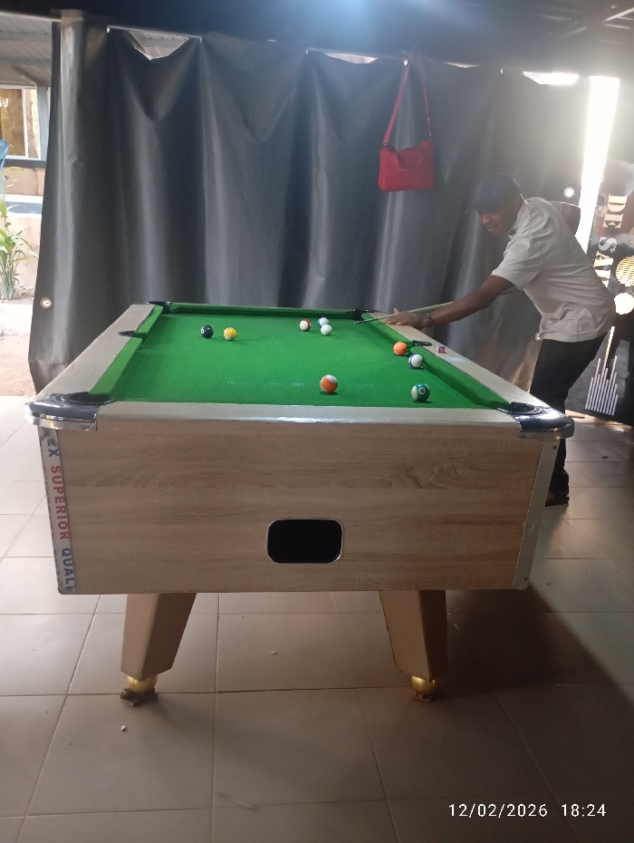 A billiards table with billiard balls is positioned in front of a large gray curtain. A red purse hangs against the backdrop. A man is leaning over the billiards table, appearing to take a shot. The table has a light wood finish, green felt, and silver corner protectors. The floor is tiled. The date "12/02/2026" is printed at the bottom right corner of the image.