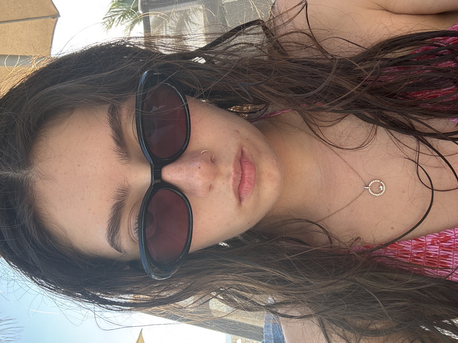 A young woman with wavy brown hair and freckled skin is lying down, wearing black sunglasses
