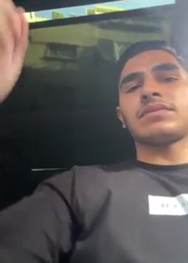 A young man is seated in a car. The sunroof is opening, revealing a multistory building outside with tan walls and multiple windows. The man is wearing a black t-shirt with the words "BE A ..." in white lettering. He looks toward the sunroof and then back to the camera.