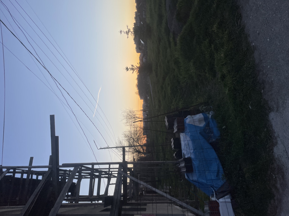 The image depicts an urban fringe area in Yambol, Bulgaria, at either dawn or dusk, indicated by the orange horizon transitioning to a pale blue sky. In the foreground, a multi-story building, possibly under construction or renovation, is visible on the left, featuring extensive dark wooden scaffolding extending upwards and horizontally. Below the scaffolding, on the ground, a blue tarp covers obscured items, with several stacks of dark roof tiles placed on top. A metal grid or fence section is present near these materials. The ground in the immediate foreground consists of a dirt or gravel path bordering a grassy area. The midground features an expansive, unkempt grassy field with sparse, leafless deciduous trees and a few slender evergreen trees. A faint dirt path traverses the field. A utility pole with multiple overhead wires is visible to the left of the field, extending from the left frame towards the center-right. In the background, a cluster of low-rise buildings and structures are silhouetted against the bright orange glow of the horizon. Above this, the sky is clear blue with a single, linear white contrail from an aircraft visible in the upper mid-frame. No individuals, direct actions, or interactions are visible within the scene.