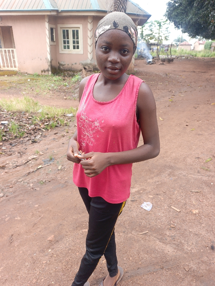 A young female with dark skin, wearing a patterned light brown headscarf, a faded pink sleeveless top with white floral designs, dark pants with a yellow stripe, and brown sandals, stands on a reddish-brown dirt path in Akwanga, Nigeria