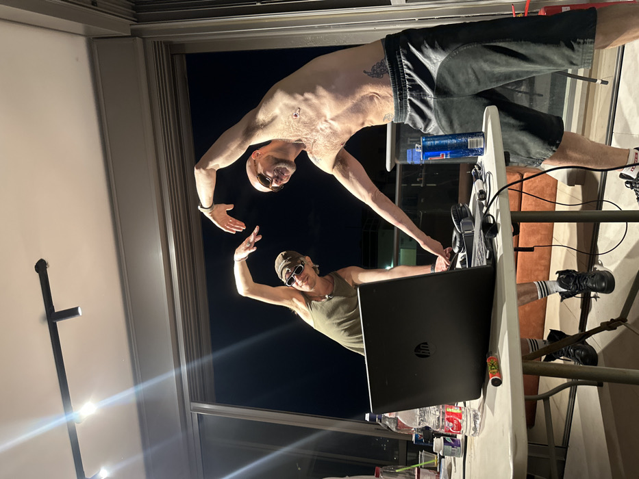 The image depicts two adult males on what appears to be an urban apartment balcony at night in Tel-Aviv, Israel. Both individuals are actively posing, their inner arms raised and bent, with their hands positioned to form the shape of a heart. The male on the left wears a khaki tank top, a beige baseball cap, and narrow oval sunglasses. His right arm is raised to form half of the heart shape, while his left hand is positioned near a black DJ controller on a light-colored table. He wears white socks with black stripes and black high-top sneakers. The male on the right is shirtless, exposing a bald head and dark sunglasses. Scars are visible across his chest and abdomen, and a dark tattoo is present on his left lower abdomen/hip area. He wears dark, possibly leather, shorts and dark sneakers. His right arm is raised and bent, mirroring the first individual's arm to complete the heart shape. His left hand is extended towards the DJ controller. On the table in front of them, a black HP laptop is open. To its right, a black DJ controller and black over-ear headphones are present. Various items are scattered on the table, including multiple plastic bottles of liquids (one large clear water bottle, one with red liquid), a blue Red Bull can, and a small, colorful cylindrical object. Cables are visible connecting the electronic equipment. The background shows a dark night sky with faint outlines of distant city buildings and lights, consistent with an urban environment. Overhead, a black track light fixture with multiple spotlights illuminates the scene. A metal and glass railing, typical of a balcony, is visible behind the individuals. A red fire extinguisher is partially visible on the floor near the right edge of the frame. The floor appears to be tiled.
