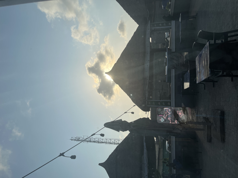 - "This image depicts an outdoor restaurant or bar environment during either sunrise or sunset, evidenced by the low sun casting prominent rays through and behind clouds, silhouetting the structures" by FM-Ndipm1, licensed under CC BY 4.0