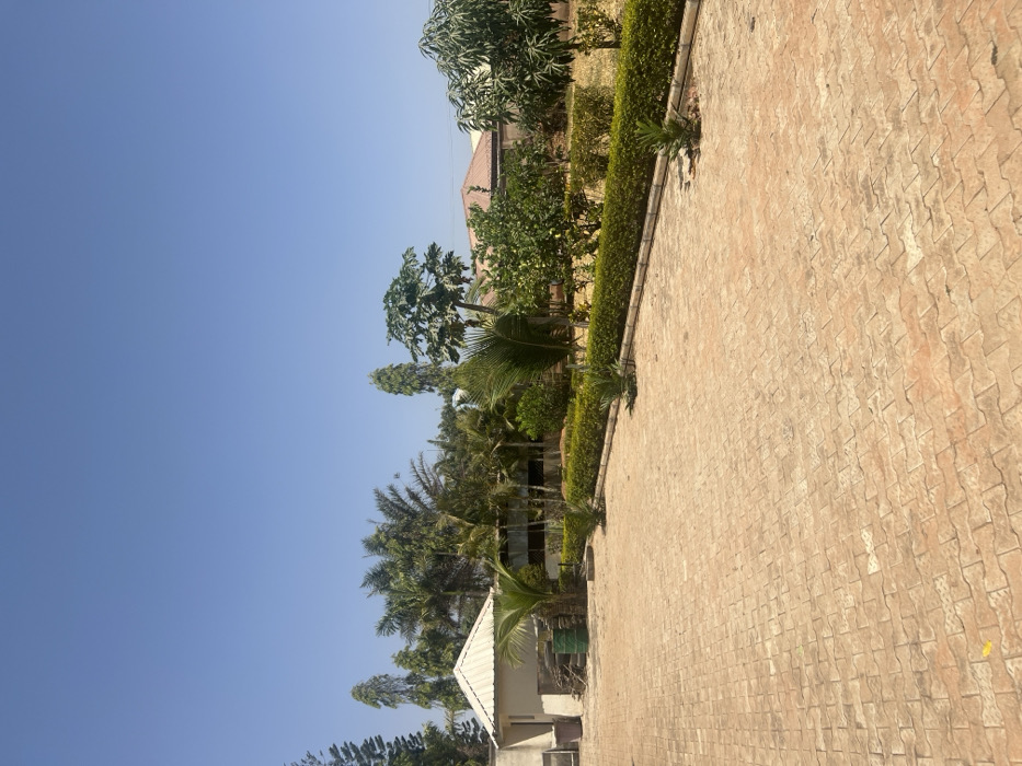 The image depicts an outdoor area in Jos, Nigeria, under a clear, bright blue sky. The foreground is dominated by light brown interlocking paving stones with a wave-like pattern. A manicured dark green hedge, approximately knee-high, traverses the midground, separating the paved surface from a vegetated garden area. Several small, young palm-like plants are visible, some planted directly into the paved ground near the hedge and others within the garden. In the mid-to-background, a variety of trees and dense foliage are present, including tall, slender trees, broader-leafed trees such as a papaya tree with its distinctive leaves, and various palm species. To the far left, a light-colored, single-story building with a white corrugated metal gable roof is visible. Adjacent to this building, a pile of assorted materials or debris is stacked. In the far background, partially obscured by trees, the terracotta-colored roofs of other buildings are discernible. No individuals or active interactions are observed in the scene. The overall impression is of a sunny, static environment, possibly a residential compound or a landscaped public space.