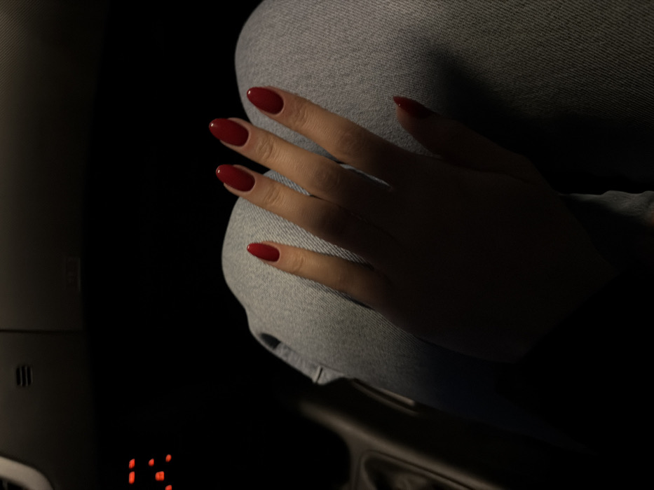 In a dimly lit interior, a hand rests on a lap clad in light gray jeans. The hand features dark skin and almond-shaped nails painted in a striking shade of red. The index, middle, ring, and pinky fingers are visible. The hand is partially shadowed, adding to the dramatic lighting. The surrounding environment suggests a car interior, with the dashboard and gear shift faintly visible in the background.