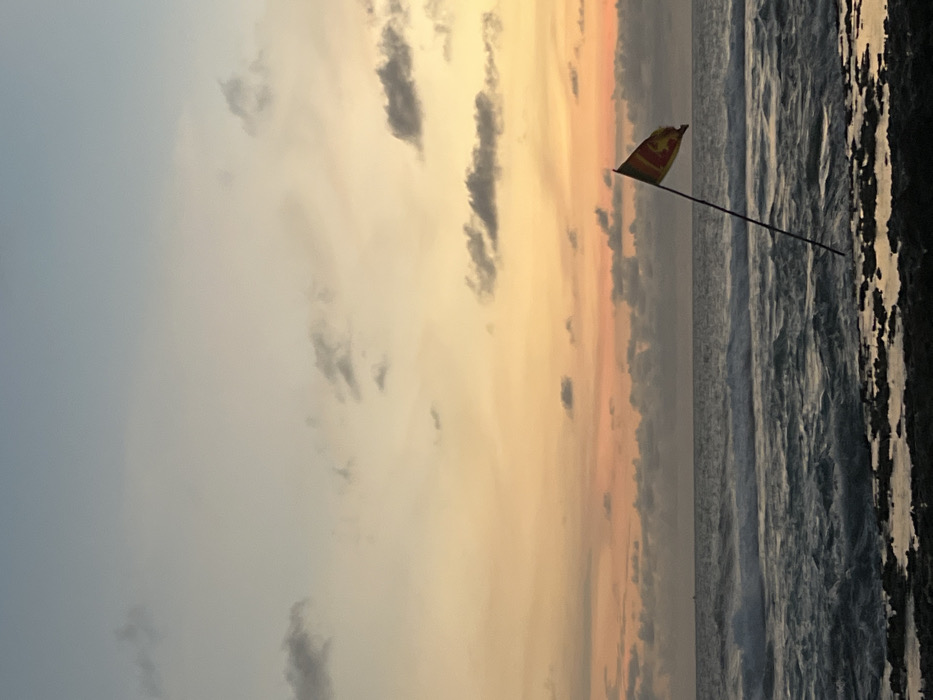 This image depicts a coastal scene in Thalaramba, Sri Lanka, during twilight hours. The sky occupies the upper portion, showing a gradient from light blue at the top, transitioning through pale yellow and orange, to a warmer pinkish hue near the horizon. Scattered grey clouds are present throughout the sky, becoming denser and more layered towards the horizon. The mid-ground is dominated by the ocean, characterized by dark, agitated water with visible white-capped waves. A faint, dark silhouette, likely a distant vessel, is discernible on the horizon line towards the left. The foreground consists of dark, wet, uneven rock formations, partially submerged by the incoming waves. A slender, dark pole is planted into these rocks, extending diagonally upwards and to the right, with its lower section submerged in the water. Affixed to the upper part of this pole is the national flag of Sri Lanka, displaying its characteristic golden lion holding a sword on a maroon field, bordered by yellow, and featuring vertical green and orange stripes. The flag is slightly unfurled, suggesting a light breeze. No individuals are visible in the scene.